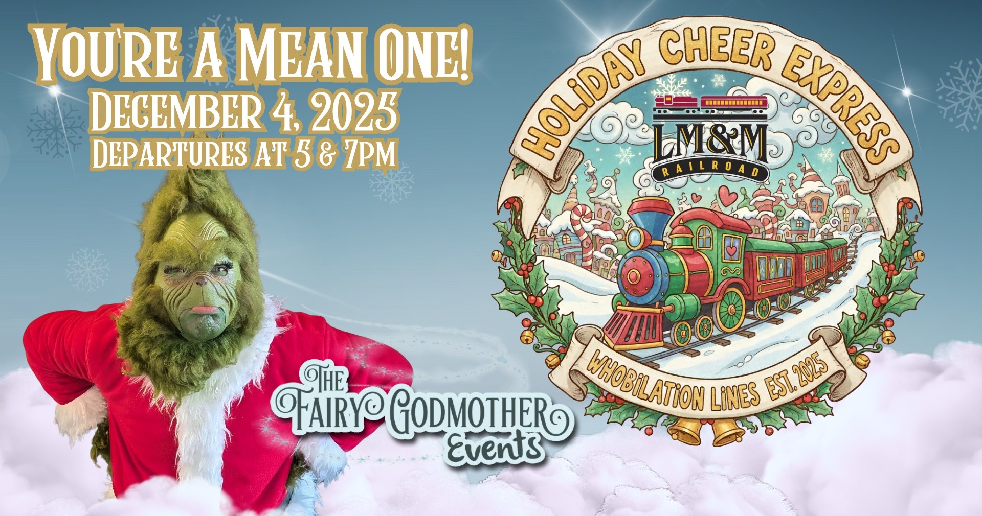 This season, The Fairy Godmother Events and the LM&M Railroad invites you to join our Holiday Cheer Express— a joyful ride through a winter wonderland where every stop jingles with spirit and sparkle. Meet a certain small town girl with a big heart and her delightfully grumpy green-tinted neighbor who’s learning what the season is really all about. Together, they’ll spread kindness, giggles, and cheer to every passenger on board!